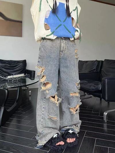 大きいサイズ レディー ハイウエスト ダメージジーンズ ストレートデニムパンツ の新作 ガウチョパンツ