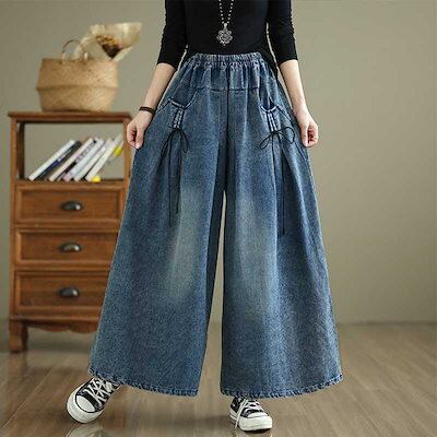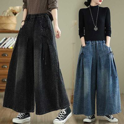 2024秋冬新品 デニムパンツ 大きいサイズ 体型カバー レディース ジーンズ ゴム ワイドパンツ ロングパンツ ハイウエスト メガ割
