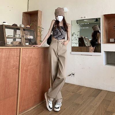 ハイウエストスリムカジュアルカーキワイドレッグジーンズレディースルーズストレートパンツ新作夏秋イントレンド30%制限