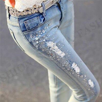 [QINGCE]スキニーパンツ デニムパンツ レディース ストレッチ ダメージ キラキラ スキニージーンズ ロング丈 美脚 ボトムス スリム お洒落 可愛い