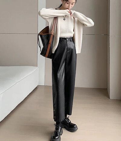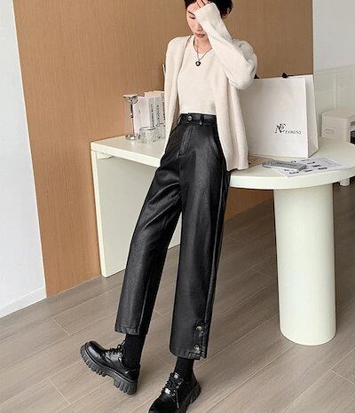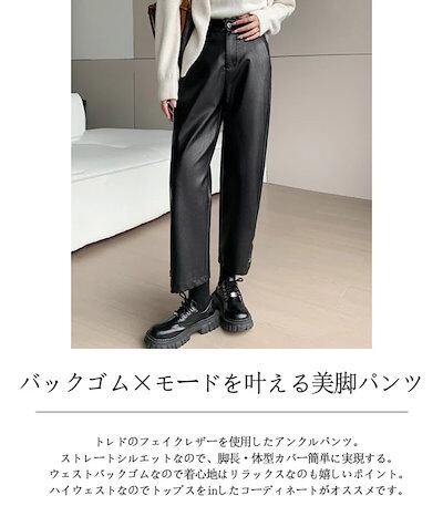 フェイクレザー パンツ レディース ストレートパンツ 黒 バックゴム ゆったり PU ワイドパンツ ハイウェスト ポケット アンクルパンツ 九分丈 低身長 高身長 フェイクレザーパンツ 八分丈