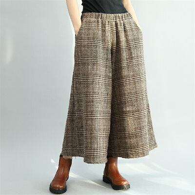 ワイドパンツ レディース チェック柄 秋冬 パンツ ロングパンツ 暖かい ボリューム ゆったり 体型カバー チェック柄パンツ アンクルパンツ 九分丈 大きいサイズ ガウチョパンツ きれいめ スカンツ