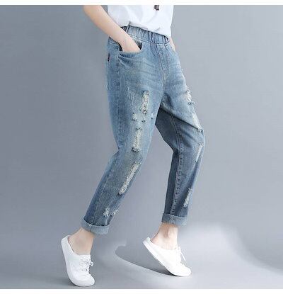 お手頃価格デニムパンツ レディース パンツ ジーパン ジーンズ ダメージ加工 ウエストゴム ゆったり ライトブルー 薄色 デニム XL 2XL 大きいサイズ ルーズ ハーレムパンツ アンクル丈 おしゃ