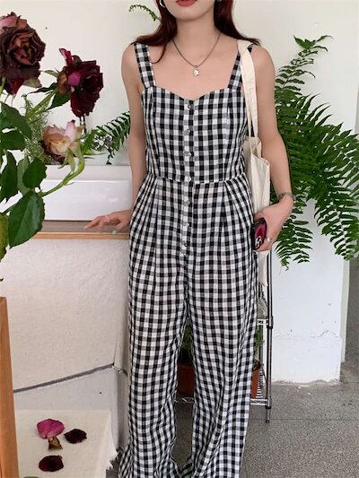 サロペット レディース 夏 春 ゆったり カジュアル オールインワン つなぎ オーバーオール パンツ ワイドパンツ ロングパンツ ワイド ロング 綿 コットン チェック柄 チェック ポケット付き 涼し