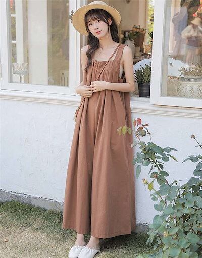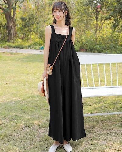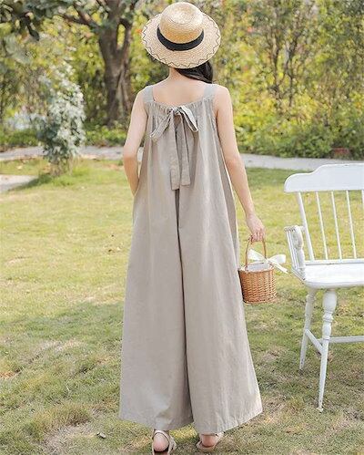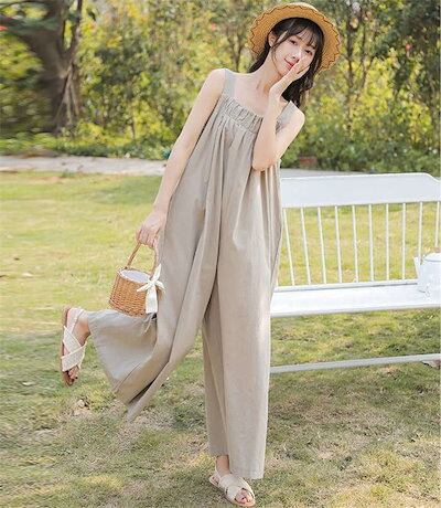 サロペットパンツ レディース 綿麻風 ノースリーブ オールインワン オーバーオール 薄手 春 夏 秋 つなぎ ワイドパンツ サイドポケット バックリボン サロペット ロングパンツ シンプル 無地 カジ