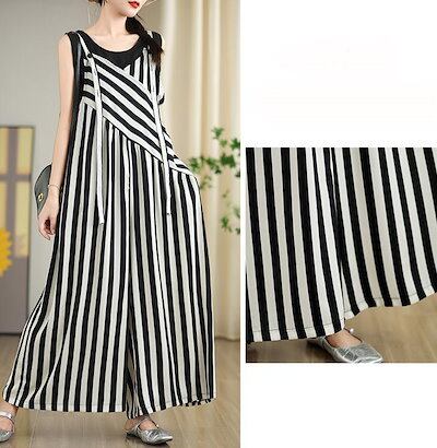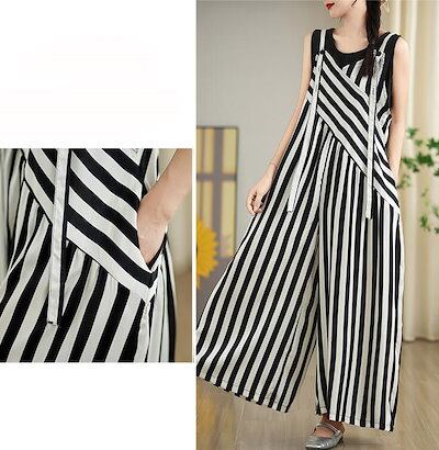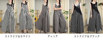 サロペット オールインワン チェック ストライプ パンツ レディース 夏 ワイドパンツ オーバーオール 9分丈 ロング丈 ノースリーブ オーバサイズ おしゃれ 大きめ 春 夏
