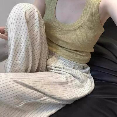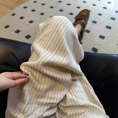 ワイドパンツ レディース 春 夏 秋 ストライプ パンツ 綿麻混 ボトムス 涼しい リネン パンツ ハイウエスト ワイド スラックス 美シルエット ハイウエスト 落ち感 着?せ 着心地 柔らかい リゾ