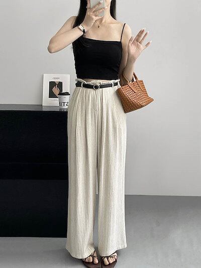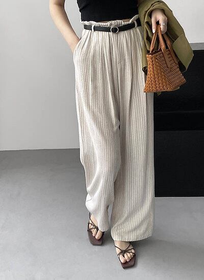 ワイドパンツ レディース 春 夏 秋 ストライプ パンツ リネン混 ボトムス 涼しい リネン パンツ ハイウエスト ワイド スラックス 美シルエット ハイウエスト 落ち感 着?せ 着心地 柔らかい リ