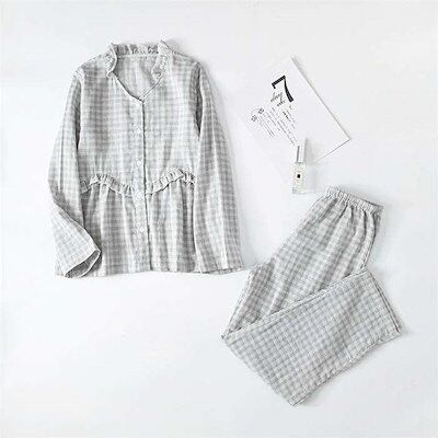 ガーゼ パジャマ レディース ルームウェア パンツ 春 秋 ガーゼコットン キーネック フリル チェック 春秋 長袖 ダブルガーゼ 2重ガーゼ 綿 部屋着 セットアップ 2点セット ナイト 寝間着 寝