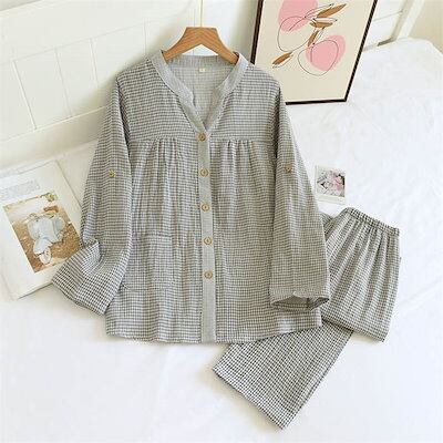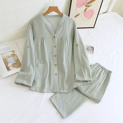 ダブルガーゼ パジャマ レディース ルームウェア パンツ 春 秋 ガーゼコットン キーネック チェック 春秋 長袖 ガーゼ 2重ガーゼ 綿 部屋着 セットアップ 2点セット ナイト 寝間着 寝巻き 上