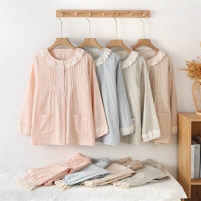ガーゼ パジャマ レディース ルームウェア パンツ 春 秋 ガーゼコットン レース フリル 春秋 長袖 ギャザー ダブルガーゼ 2重ガーゼ 綿 部屋着 セットアップ 2点セット ナイト 寝間着 寝巻き