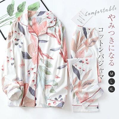 パジャマ 前開き レディース ルームウェア 長袖 フェミニン 部屋着 セットアップ 2点セット ロングパンツ 綿 花柄 総柄 コットン 大人 ナチュラル 寝巻き ナイトウェア ゆったり 上下セット 春
