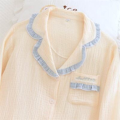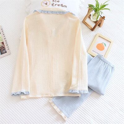 ガーゼ パジャマ レディース ルームウェア パンツ フリル 無地 配色 春 秋 ガーゼコットン キーネック 春秋 長袖 綿 部屋着 セットアップ 2点セット ナイト 寝間着 寝巻き 上下セット 前開