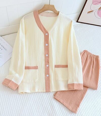 綿 ガーゼ パジャマ レディース ルームウェア パンツ 春 秋 切り替え 配色 春秋 長袖 ダブルガーゼ 2重ガーゼ 綿 部屋着 セットアップ 2点セット ナイト 寝間着 寝巻き 上下セット 前開き