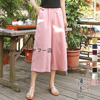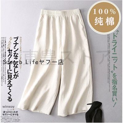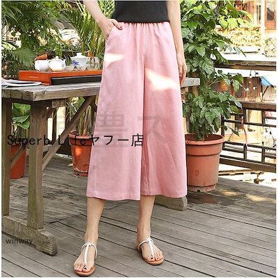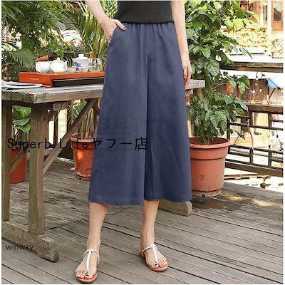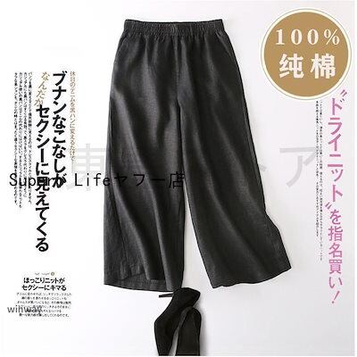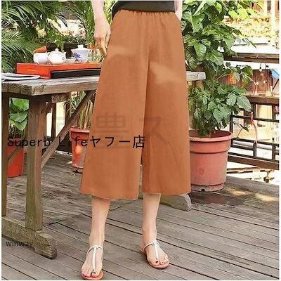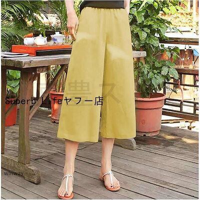 ワイドパンツ ガウチョパンツ レディース 綿混 パンツ 春 秋 夏 パンツ ボトムス ウエストゴム 涼しい 7分丈 体型カバー薄手