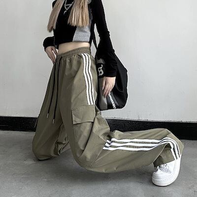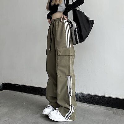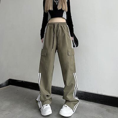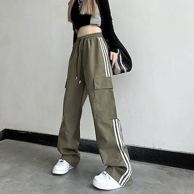 韓国 サイドライン カーゴパンツ レディース ウエストゴム ハイウエスト ワイドパンツ トレート ゆるダボ ゆったり ルーズ 着? ストリートカジュアルスポーティー