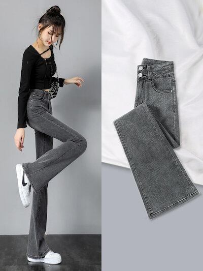 人气 新作 デニムパンツ スモークグレー ジーンズ レディース 春秋 ストレッチ 9つのポイント フレアパンツ
