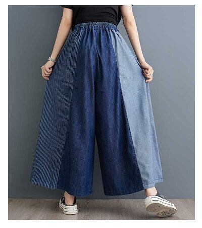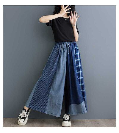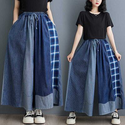 「ファットガール」 2024夏新品 レトロ デニム ドッキング ワイドパンツ フレア 大きいサイズ 巾着 ゴム 体型カバー レディース キュロットスカート ロングパンツ メガ割