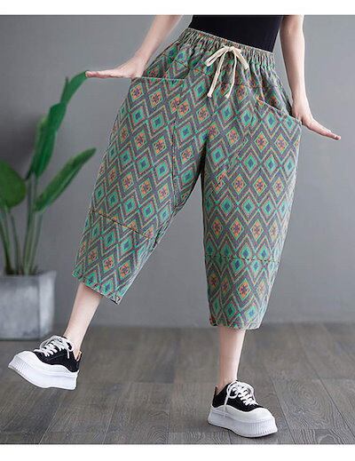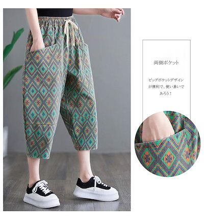 ウェスト紐付き ジンーズ ゴム式 プリント ビッグポケット エスニック デニム ボトムス テーパードパンツ 七分丈パンツ レディース 総柄 ジーパン ロング丈 バルーンパンツ ズボン 切り替え 七分丈