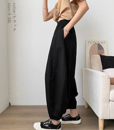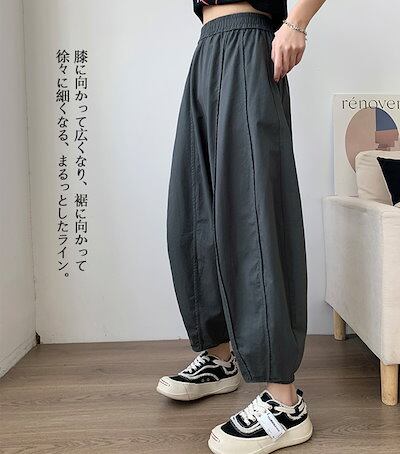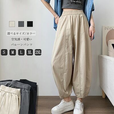 ワイドパンツ レディース パンツ コクーンパンツ ゆるパンツ 綿 空気感 ゆったり 大きいサイズ 丸いシルエット 春夏 ハイウェスト ポケット 総ライン 切り替え バルーンパンツ ウェストゴム ロング