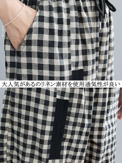 体型カバー 大きいサイズ 春夏 春 美脚 ウエストゴム ガウチョウ シルエット リラックス ワイドパンツ レディース サルエルパンツ リネン混 チェック柄 9分丈 パンツ ゆったり バルーンパンツ イ