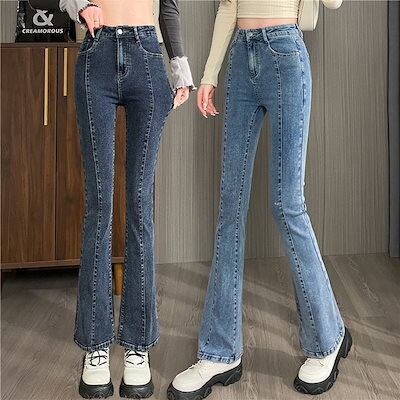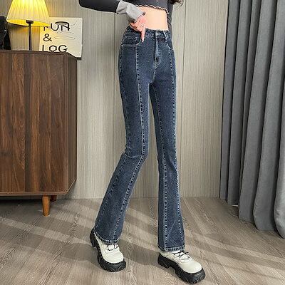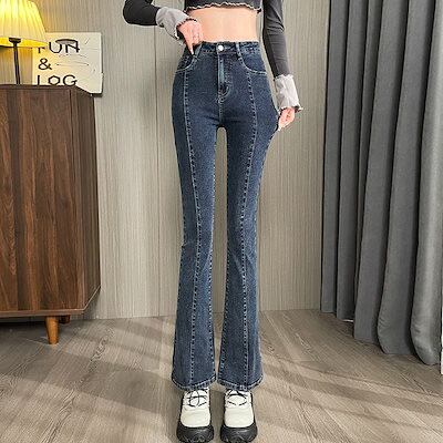 3日以内出荷脚長効果スキニーデニムパンツ 小柄通勤ハイウエスト継ぎ目スリムマイクロフレアジーンズ レディース 韓国