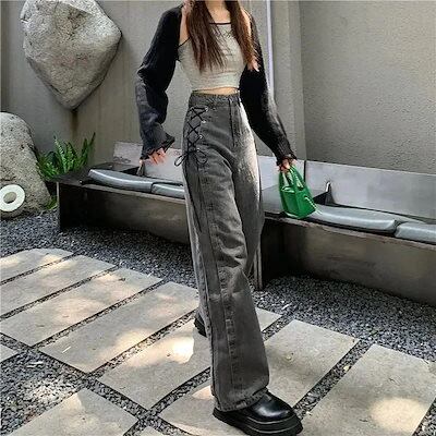 グレー ジーパン レディー 韓国 ハイウエスト 着痩せ ズボン ゆったり 流行り ストレートワイドパンツ