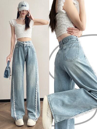 【2枚購入で 2oo円OFF!】2025 夏 新作 テンセル デニムパンツ レディース レース ゆったり ストレート カジュアル ハイウエスト ドレープ感 アメリカンレトロ ワイドレッグパンツ 通勤