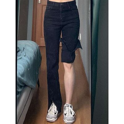 [cos衣料]大きいサイズの開叉ジーパン女性はやせて見える梨の形の太った妹mmマイクロラッパの黒いズボンのハイウエストストレートデニムボトムス 23 レディース