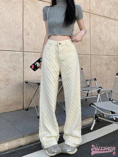 [cos衣料]パンツ デニム ジーンズ モップパンツ ジャガード ワイド ストレート ハイウエスト 脚長効果 美脚効果 細見え カジュアル ホワイト 白 韓国ファッション レディース お出かけ