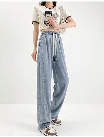 24新作 デニムパンツ レディース パンツ 冷感 ワイドパンツ ワイド デニム ストレッチ ストレート ボトムス 吸汗 速乾 通気 UVカット 涼しい ウエストゴム ハイウエスト ポケット ゆ