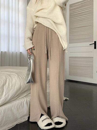 ワイドパンツ ニットパンツ レディース スリットパンツ イージーパンツ スリット入り フレアパンツ ストレッチ ウエストゴム ボトムス 美脚 無地 ロングパンツ ボトム ズボン 春 秋 冬 カジュアル
