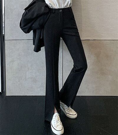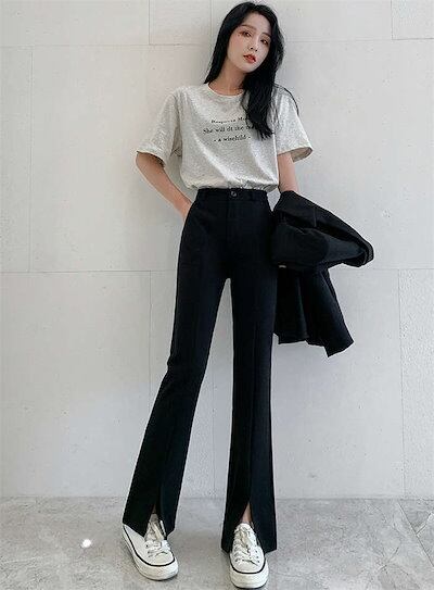 ロングパンツ レディース スリットパンツ 春 秋 秋 無地 スリット パンツ きれいめ ストレッチパンツ 9分丈 ロング丈 ボトムス ズボン フレア スラックス 黒パンツ フロントスリット おしゃれ