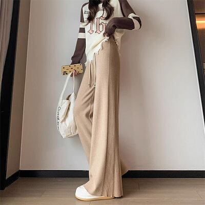 サイドプリーツ ニットパンツ レディース 秋冬 ニット ストレッチ パンツ ワイドパンツ ストレートパンツ ロングパンツ リブニット イージーパンツ ワイド ニット ボトムス 体型カバー ウエストゴム