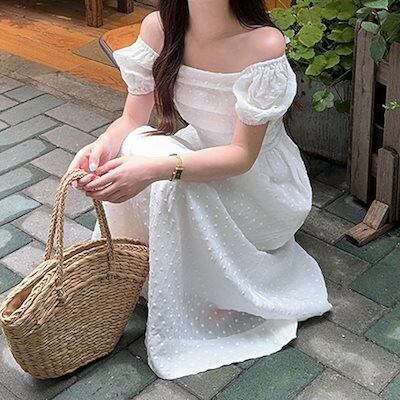 2024春夏ワンピース 半袖 ロング丈 オフショルダー スクエアネック Aライン フレア ゆったり 細見え 夏 白 ホワイト おしゃれ かわいい 甘め キュート ラブリー 韓国ファッション レディース