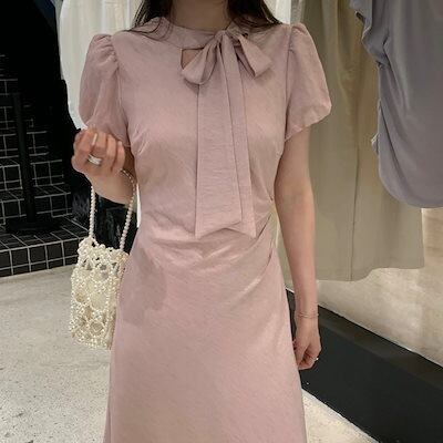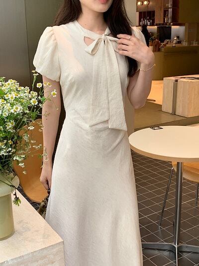 2024春夏ワンピース 半袖 リボン ミモレ丈 Aライン ゆったり 細見え 夏 白 おしゃれ かわいい きれいめ 甘め キュート ラブリー 韓国ファッション レディース お出かけ