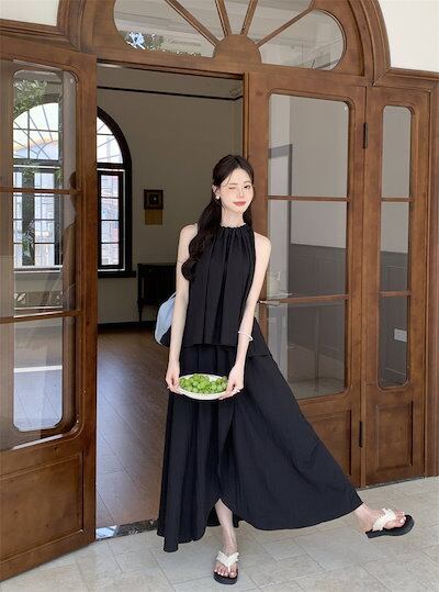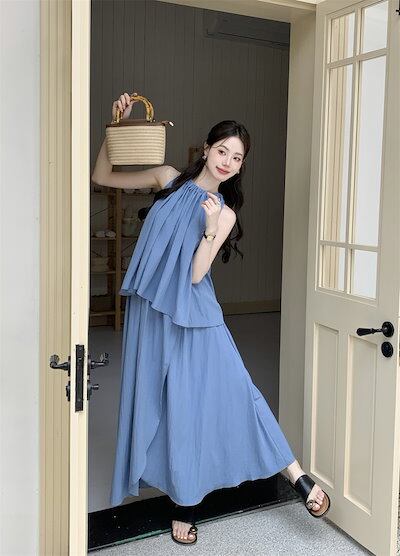 2024夏 韓国セットアップ シャツ ホルターネック ノースリーブ スカート ロング丈 Aライン ゆったり 細見え 夏 青 黒 きれいめ おしゃれ かわいい 韓国ファッション レディース お出かけ