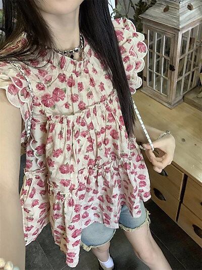 2024夏 韓国トップス シャツ 半袖 スタンドカラー フラワー 花 ゆったり かわいい おしゃれ 大人っぽい フレンチ きれいめ カジュアル 韓国ファッション系 レディース お出かけ