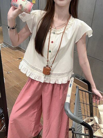 2024 春夏パンツ ロング丈 ワイド フレア ハイウエスト 美脚効果 脚長効果 細見え 夏 ピンク ガーリー キュート おしゃれ かわいい 韓国ファッション レディース お出かけ