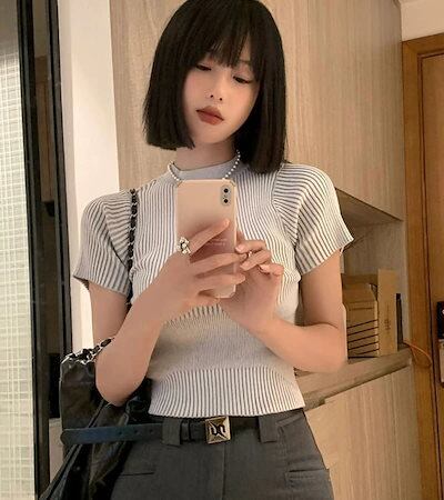2024 夏 韓国 甘い トップス Tシャツ クルーネック丈 休日 フレンチ 韓国 ブラウス ファッション タイト スリムフィット丈短め ショート レディース 休日 おしゃれ T