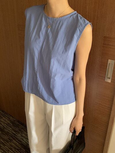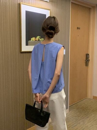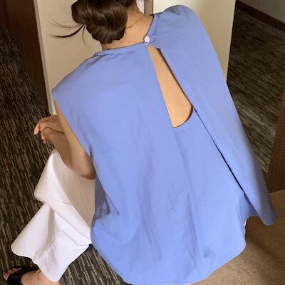 2024 春夏トップス シャツ ラウンドネック ノースリーブ バックオープン ゆったり 細見え 夏 青 黒 白 きれいめ おしゃれ かわいい キュート 韓国ファッション レディース お出かけ
