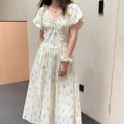 2024春夏ワンピース ロング丈 Vネック 半袖 バブル袖 花柄 Aライン リボン ゆったり 細見え 夏 カジュアル おしゃれ かわいい キュート 韓国ファッション レディース お出かけ