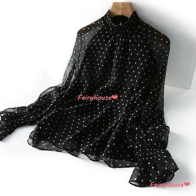 メガ割 ブラウスレディース 40代 オシャレブラウス 新作 シフォンブラウス ドット柄ブラウス パフスリーブ 長袖トップス 韓国風 通勤L ゆったりシャツ 30代50代