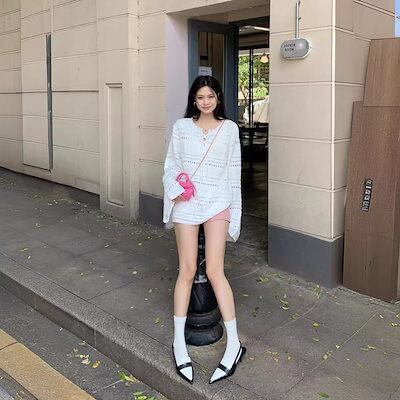 透かし彫りの白ニットレディース新作春のデザイン感小人数ゆったり長袖トップスシックなボトムins