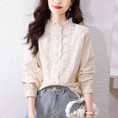 今っぽシアーシャツ カーディガン オフィス ブラウス 長袖 レースレースネック 韓国ファッション レディース シャツ 春服新作刺繍フラワートップス リピ一ト率が高い