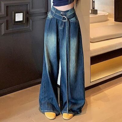 2025夏 韓国パンツ デニム ジーンズ ロング丈 ワイドレッグ ウォッシュ加工 ベルト ハイウエスト 美脚効果 脚長効果 細見え 夏 白 青 おしゃれ かわいい 韓国ファッション レディース お出か
