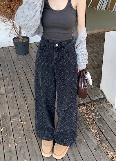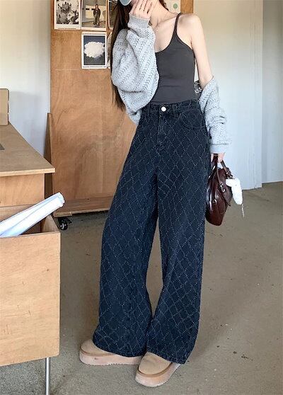 2025 春夏パンツ デニム ジーンズ モップパンツ ジャガード 菱形 ワイド ストレート ハイウエスト 脚長効果 美脚効果 細見え 春 黒 ブラック カジュアル 韓国ファッション レディース お出か