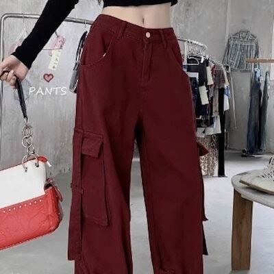 2025 パンツ デニム ジーンズ ロング丈 ワイド ハイウエスト 美脚効果 脚長効果 細見え 秋 エンジ レッド 赤 おしゃれ かわいい 韓国ファッション レディース お出かけ