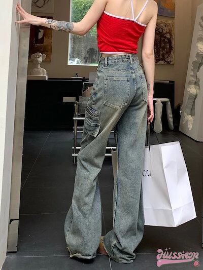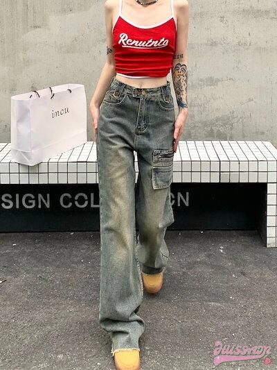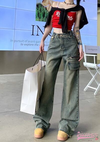 パンツ デニム ジーンズ ワイド ストレート ハイウエスト 脚長効果 美脚効果 細見え ウォッシュ加工 フリンジ 春 カジュアル 韓国ファッション レディース お出かけ