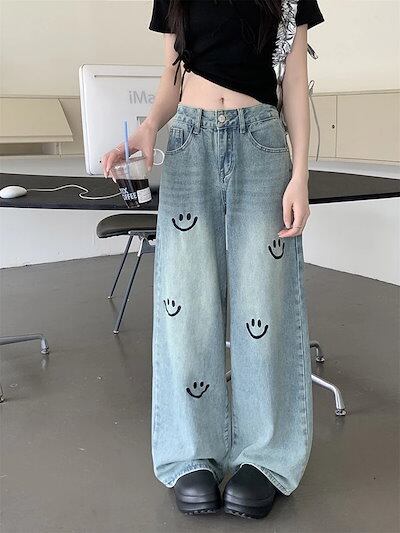 2025 春夏パンツ ロング丈 デニム ジーンズ ワイド ハイウエスト 美脚効果 脚長効果 細見え 夏 水色 ニコちゃん スマイル おしゃれ かわいい 韓国ファッション レディース お出かけ
